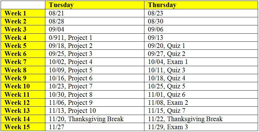 Quiz, Exam and Project Schedules