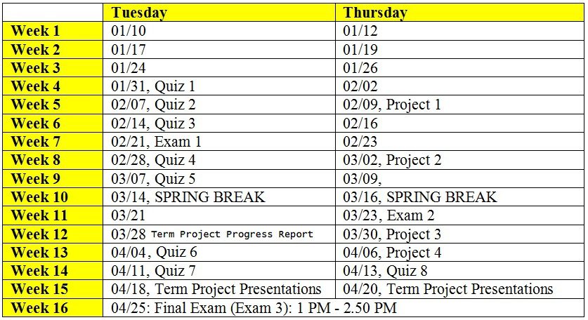 Quiz, Exam and Project Schedules